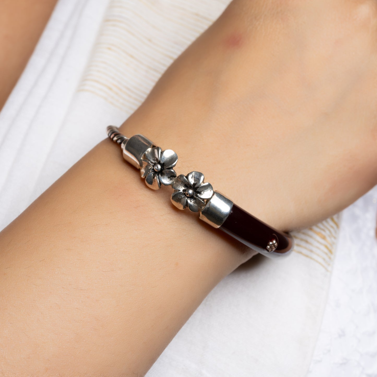 Iron-Silver Two-Line Twisted Casting Flower Design Bangle