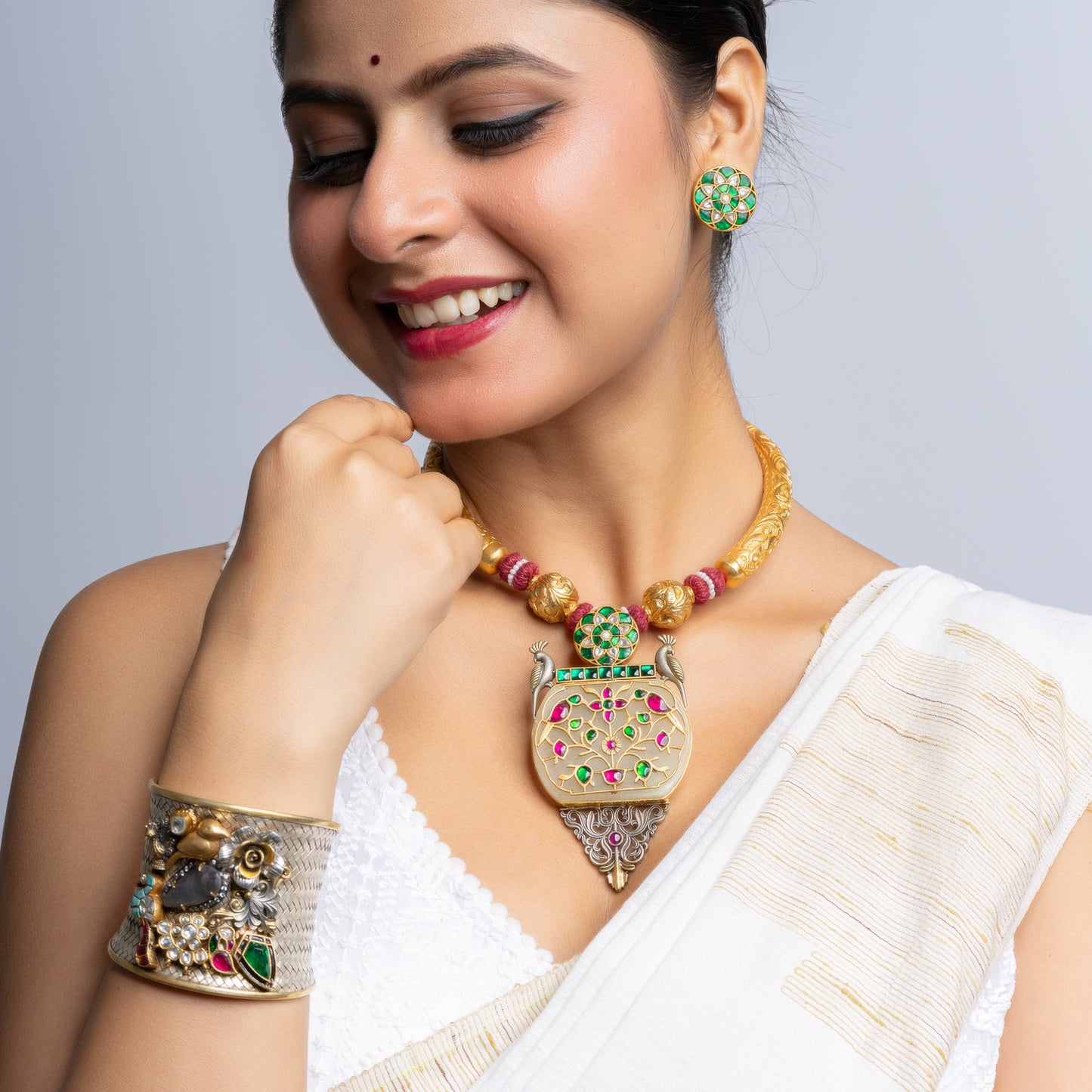 Silver Rajasthani Chitai Pendant Set with Multi Coloured Stones
