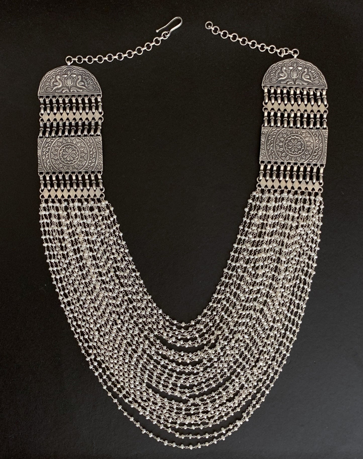 Cultured pearl "Multi-string" necklace with intricate silver carvings. These are good quality pearls strung in 92.5% sterling silver.