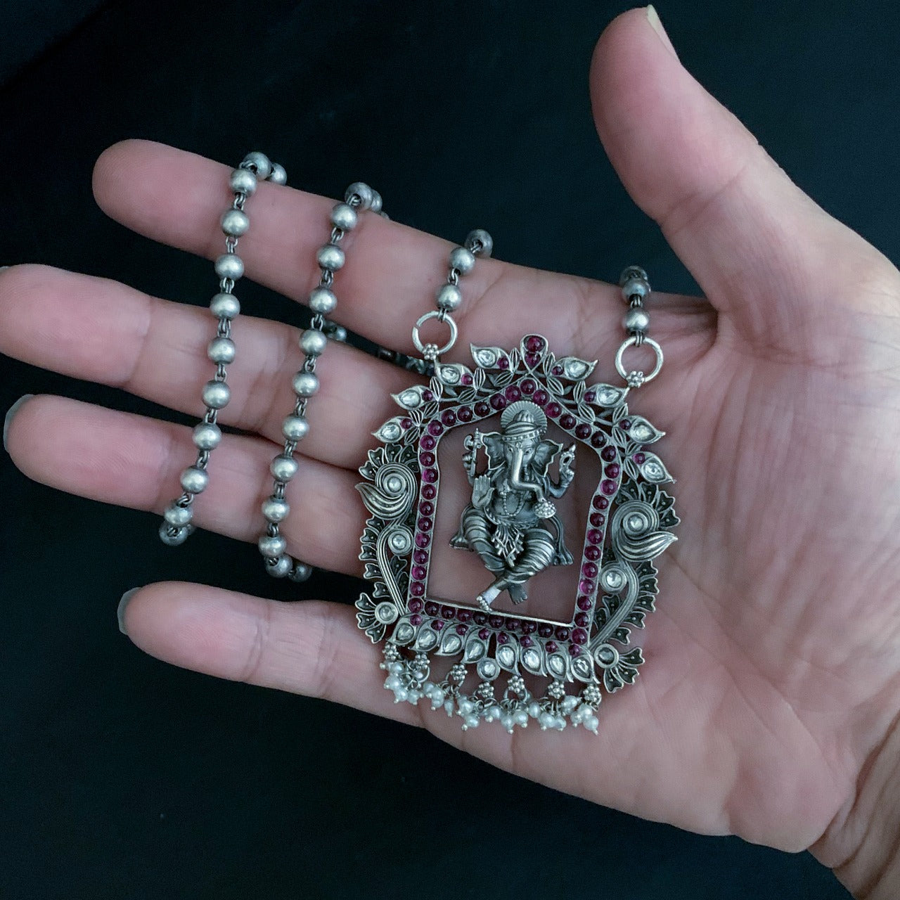 Silver handmade Ganesh nakshi pendant with cultured pearls